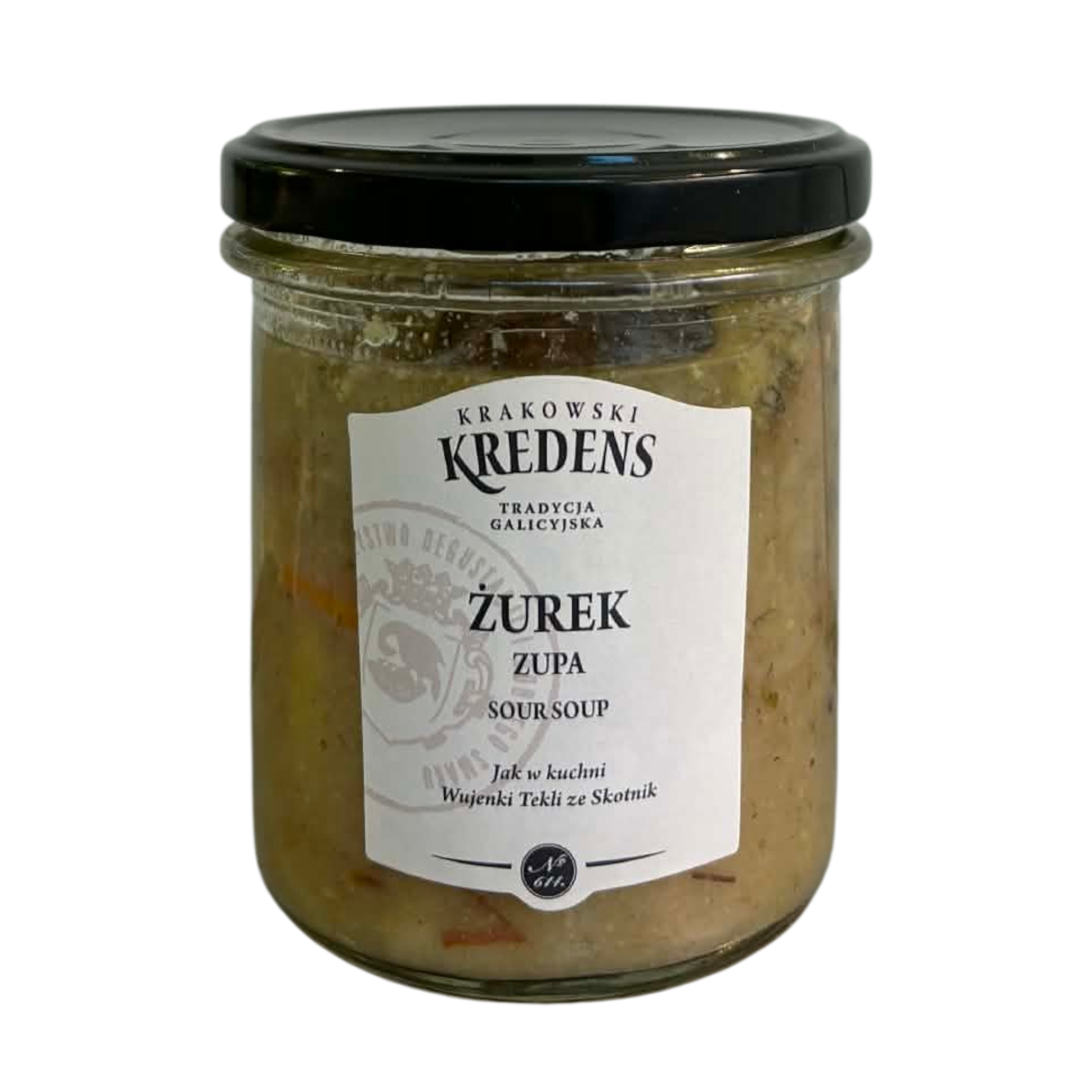 Skład: woda 51%, kiełbasa biała, boczek surowo-wędzony, żeberka wędzone, marchew, cebula, SELER, pietruszka, majeranek, ziele angielskie, czosnek, pieprz czarny, ziemniaki, grzyby suszone, żur (woda, MĄKA ŻYTNIA, czosnek, liść laurowy, ziele angielskie), sól, substancja konserwująca.